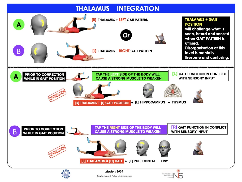 During left gait function, the sensory input signals can fail to activate with right thalamic control - (the converse applies). Disorganisation at this level is mentally tiresome and confusing until corrected.